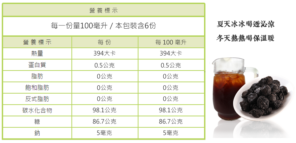 食用方法: 1.沖泡前請先將瓶裝烏梅汁搖一搖濃縮烏梅汁-補血生津、美膚養顏(烏梅果粒會沉澱於瓶底) 2.濃縮烏梅汁以(建議比例)1:6之倍數加入冰(溫)開水稀釋攪拌後飲用,倍數可依個人喜好增減。 3.也可以當做料理食材的調味料,讓你的蒸魚,滷味.滷豬腳.紅燒排骨......與眾不同.更添美味. 營養成分標示: 本產品是以濃縮原汁檢驗,實際數據需除以稀釋倍數。
